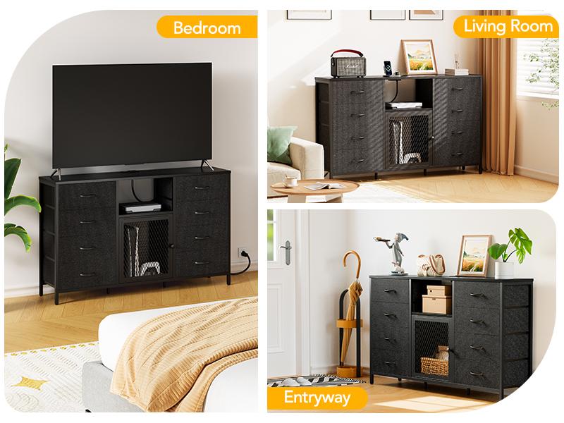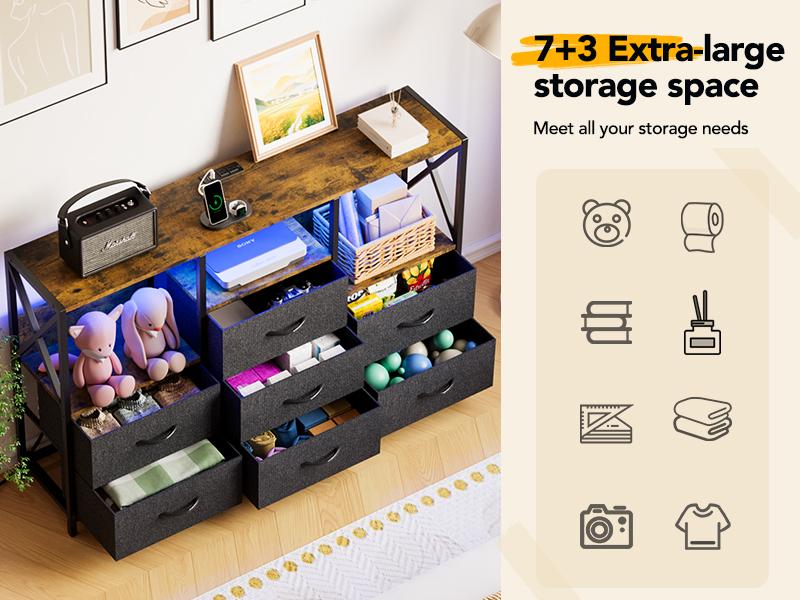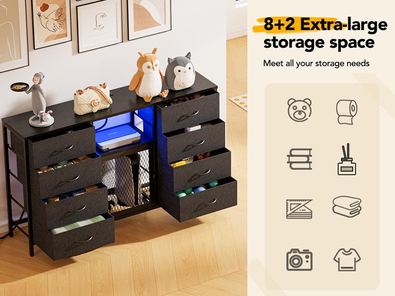 Decofy Dresser for Bedroom, 52 Inch Dressers TV Stand with LED Light and Power Outlets, 8 Fabric Dressers Chest of Drawers,Large Dresser Storage Organizer Kids Furniture Closet, Black Wooden Top