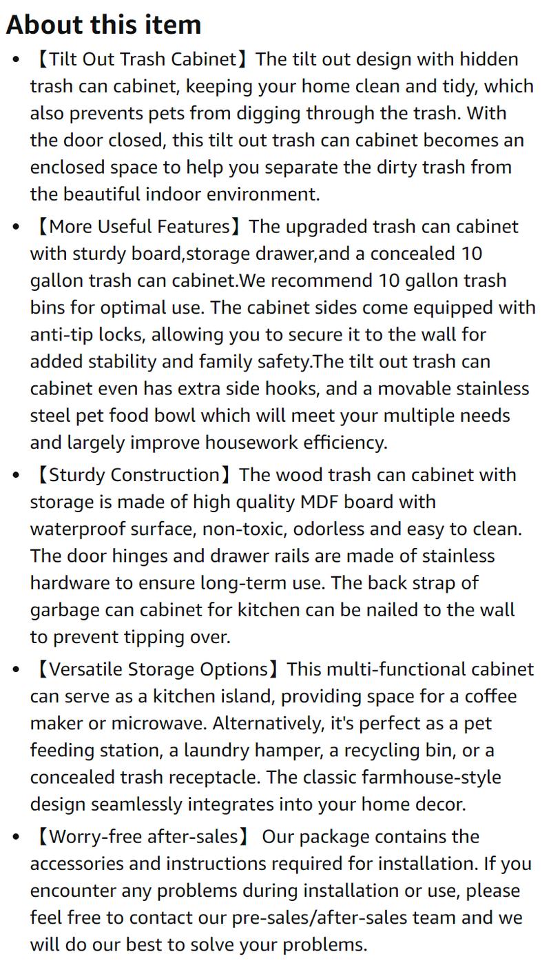 - Package includes: 1 x Tilt-Out Trash Cabinet