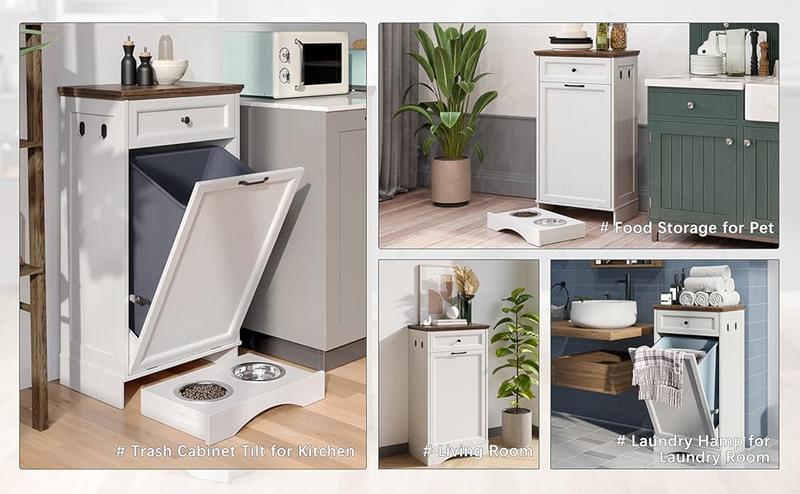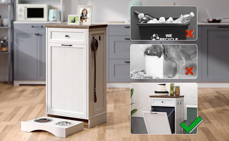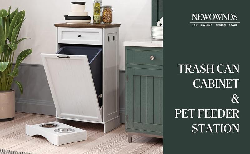 The NEWOWNDS tilt-out trash can cabinet features a hidden trash bin space, a spacious drawer, and 2 pet feeding bowls. It not only eliminates odors but also enhances the aesthetics of your kitchen, which can serve as a trash can cabinet, dog food cabinet, tilt-out laundry hamper, kitchen island, and more.